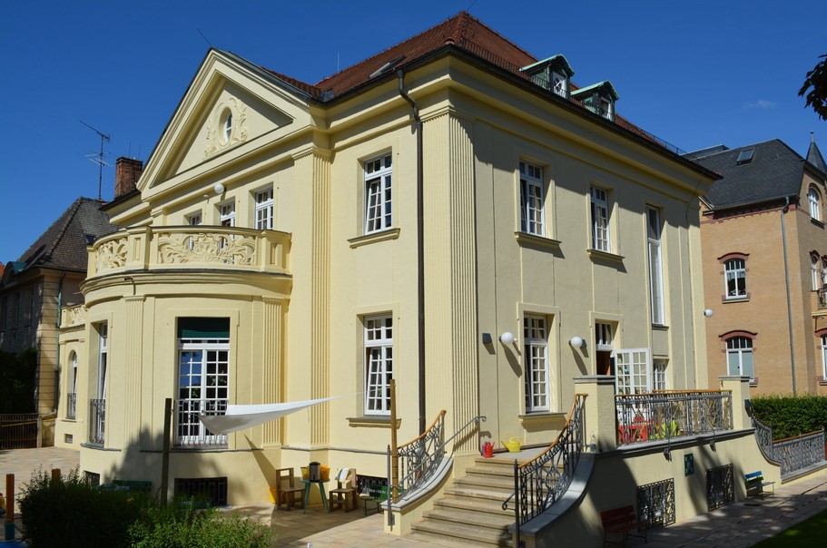 Unsere Kindertagesstätte, eine schöne denkmalgeschützte Villa, liegt am Rande des Stadtzentrums inmitten der Nordvorstadt von Zwickau. Ein großer Garten mit Bäumen und Sträuchern umgibt das Haus. Die Kinder können klettern, schaukeln, wippen, Spaß haben, aber sie können sich auch ruhige Ecken zum Entspannen suchen. Ein Kräuterbeet, ein großer Sandkasten und ein Gartenhaus mit Spielmaterial und Fahrzeugen ermöglichen unseren Kindern, sich zu beschäftigen und vielfältige Erfahrungen zu sammeln.
